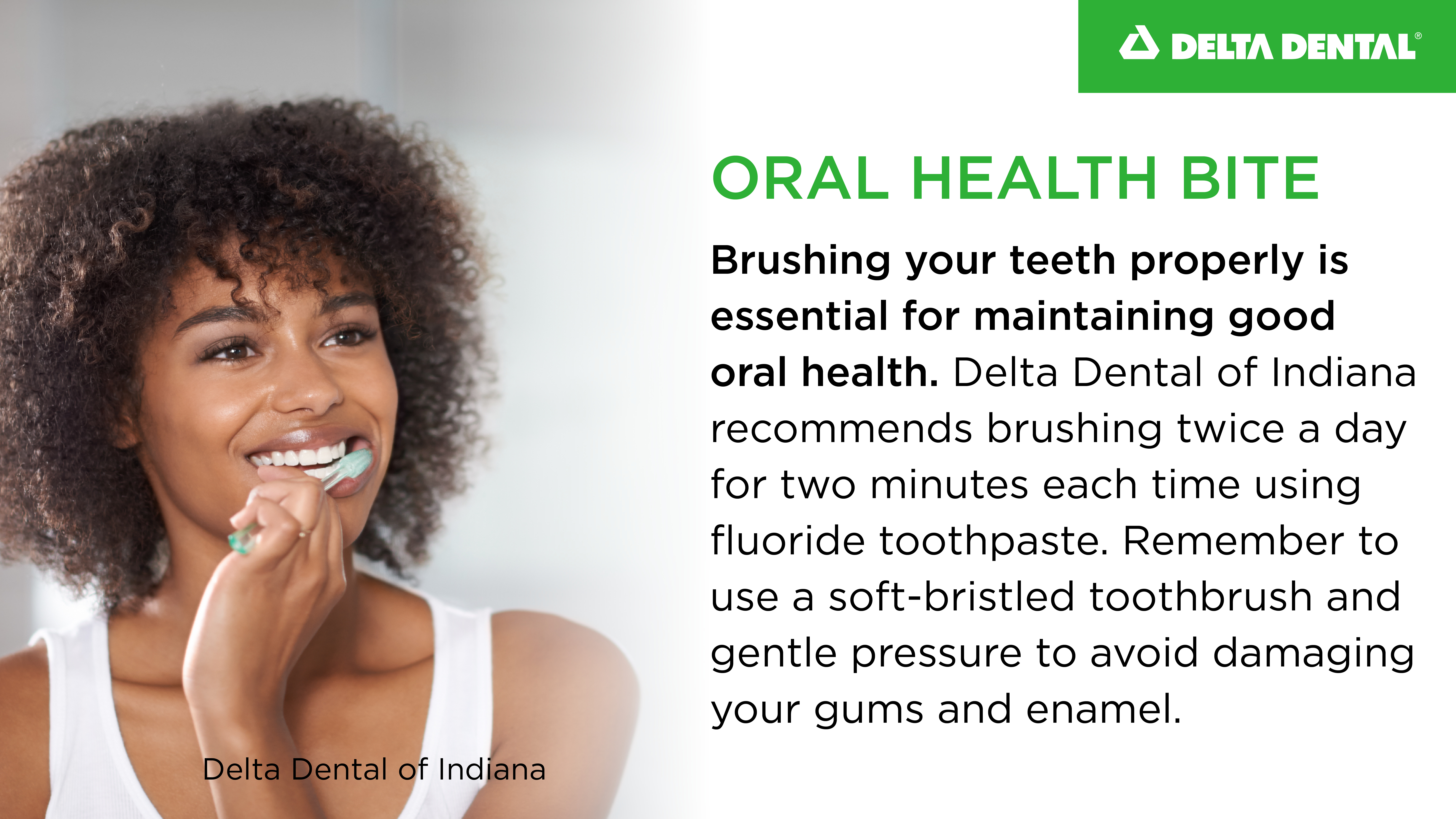 Brushing your teeth properly is essential for maintaining good oral health. Delta Dental of Indiana recommends brushing twice a day for two minutes each time using fluoride toothpaste. Remember to use a soft-bristled toothbrush and gentle pressure to avoid damaging your gums and enamel. Don’t forget to replace your toothbrush every three to four months or sooner if the bristles are frayed. Get more tips on brushing here.