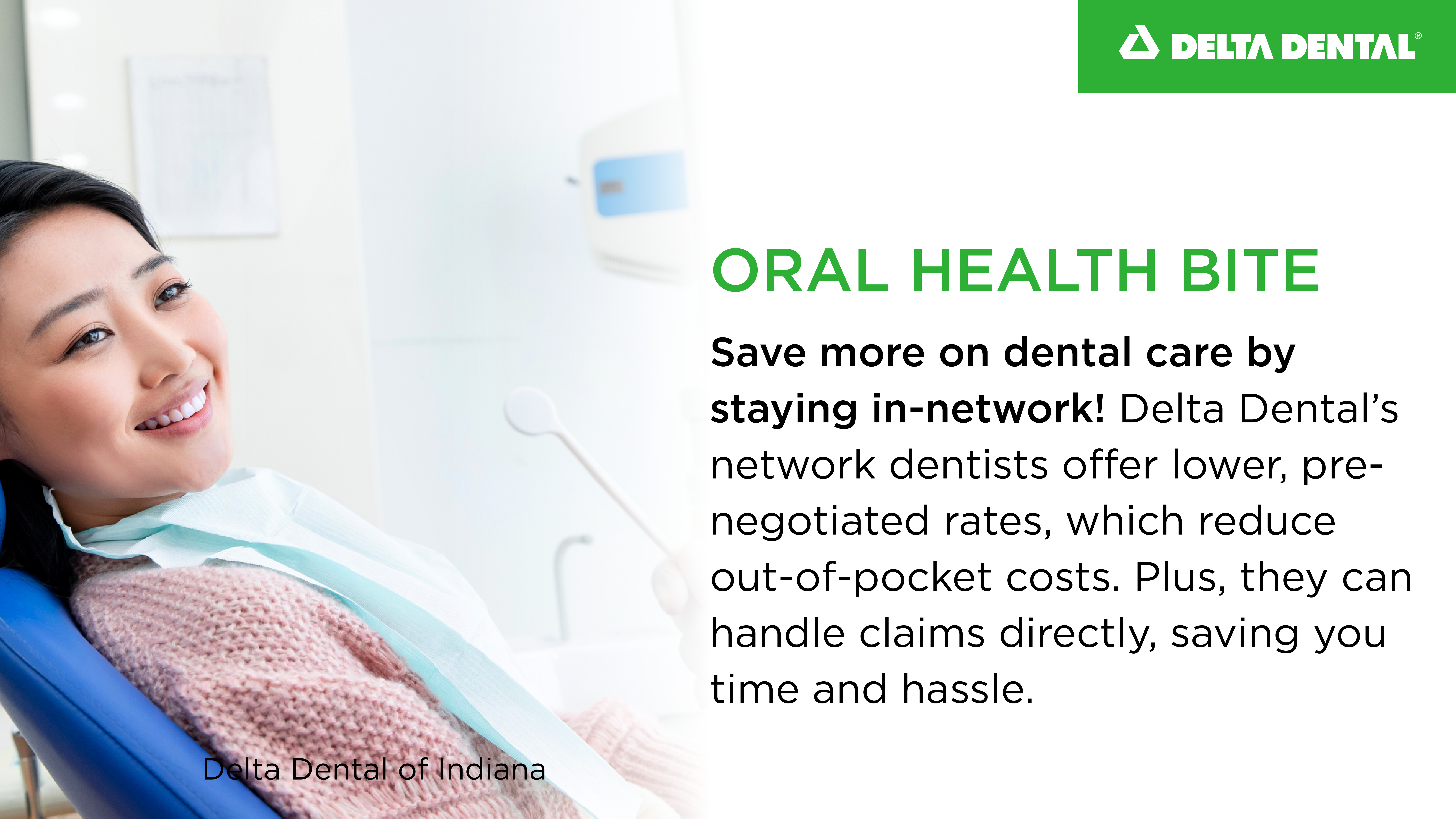 Save more on dental care by staying in-network! Delta Dental’s network dentists offer lower, pre-negotiated rates, which reduce out-of-pocket costs. Plus, they handle claims directly, saving you time and hassle. Visit memberportal.com to find a network dentist.